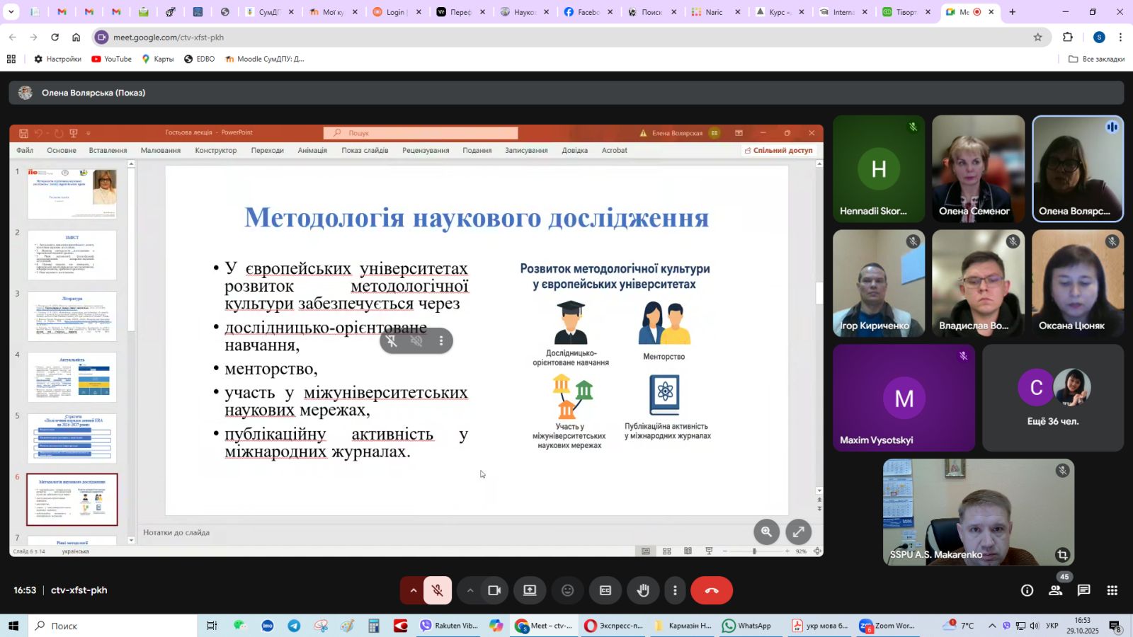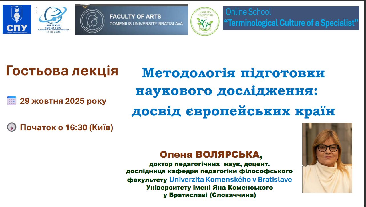 29 жовтня 2025 року здобувачі та професорсько-викладацький склад кафедри менеджменту освіти та педагогіки вищої школи мали можливість долучитись до гостьової лекції Олени ВОЛЯРСЬКОЇ, доктора педагогічних наук, доцентки, дослідниці кафедри педагогіки філософського факультету Університету імені Яна Коменського у Братиславі (Словаччина). Тема лекції: «Методологія підготовки наукового дослідження: досвід європейських країн».