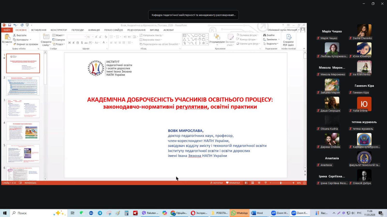 11-12 березня 2026 року здобувачі освіти та професорсько-викладацький склад кафедри менеджменту освіти та педагогіки вищої школи взяли участь у роботі ІІ Всеукраїнського наукового форуму «Сучасні технології формування конкурентоспроможного менеджера: методологія, практика, перспективи», спільно організованого кафедрою педагогічної майстерності та менеджменту імені Івана Зязюна Полтавського національного педагогічного університету імені В.Г. Короленка.