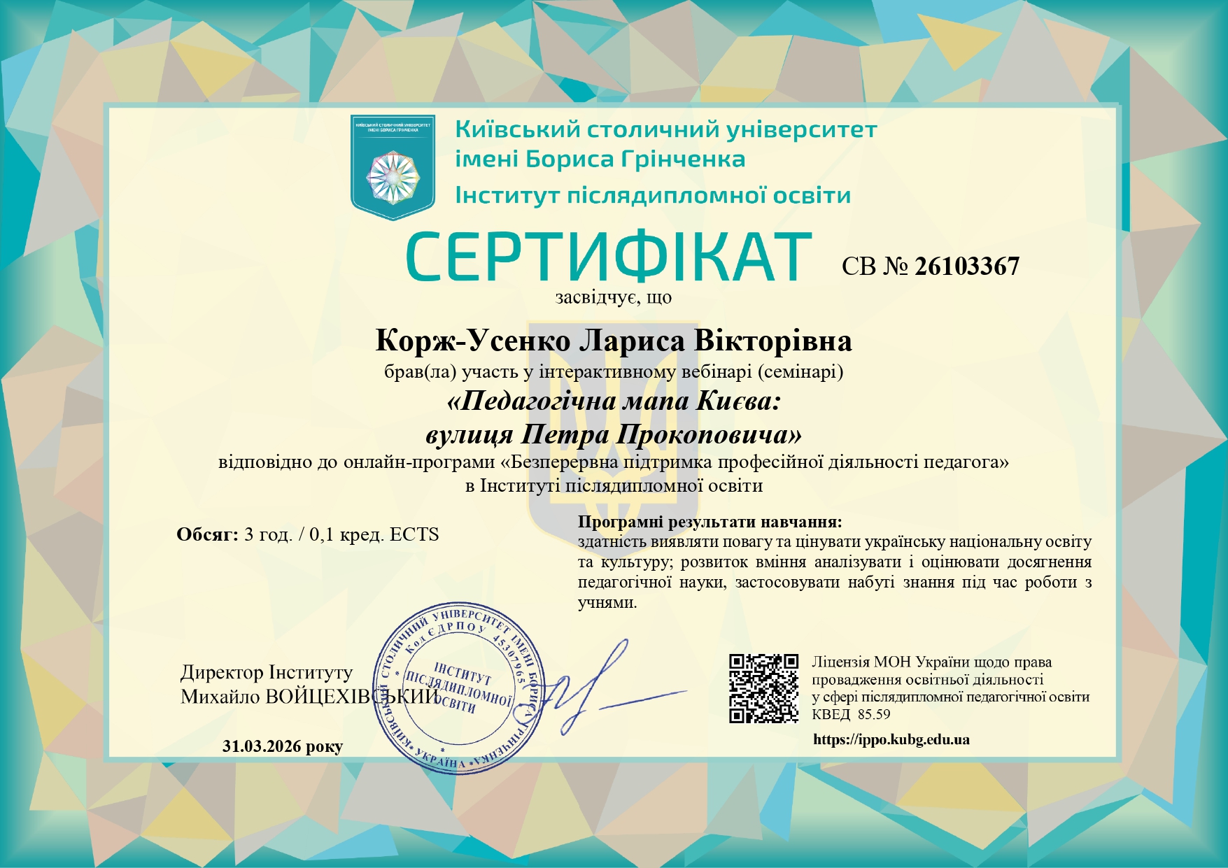 У роботі вебінару взяла участь викладачка нашої кафедри – доктор педагогічних наук, професор Лариса КОРЖ-УСЕНКО. Разом із колегами з Києва, Кропивницького та Сумської області вона долучилася до обговорення педагогічної спадщини Петра Прокоповича, зокрема його новаторських підходів до організації професійної освіти та формування екологічного мислення у молоді.