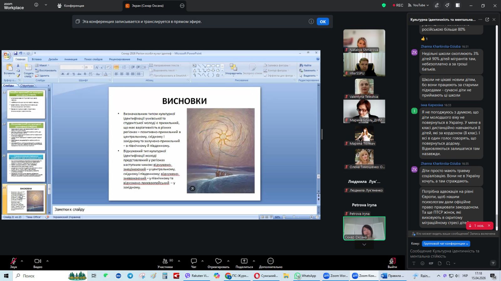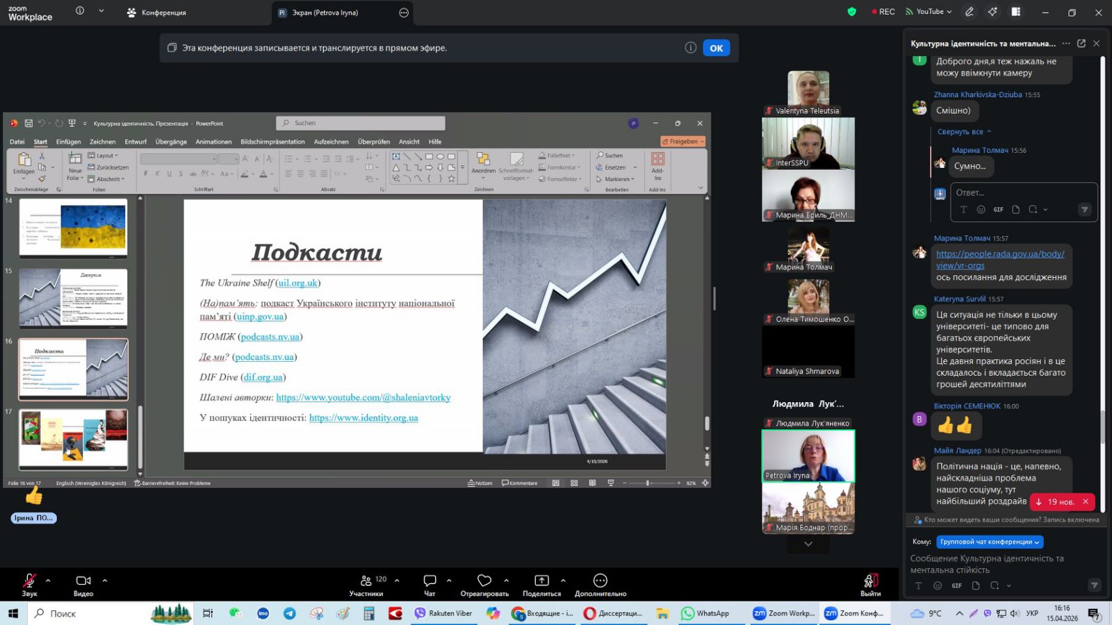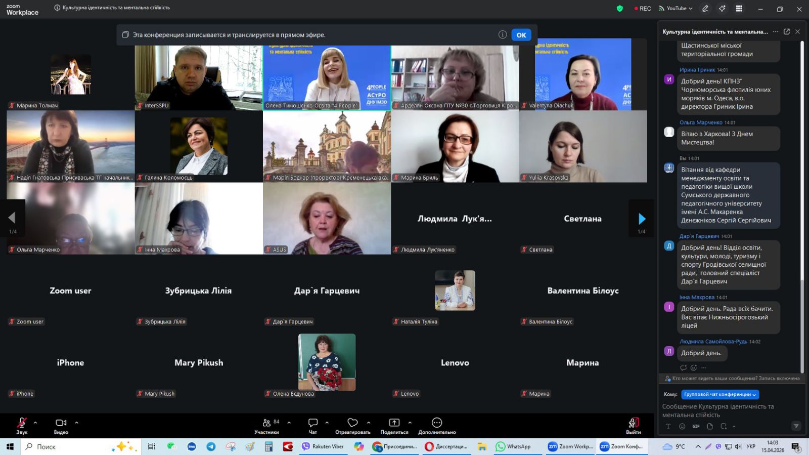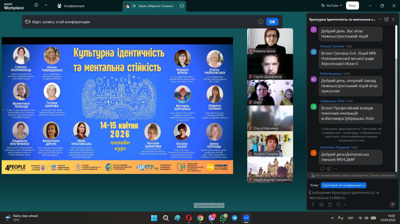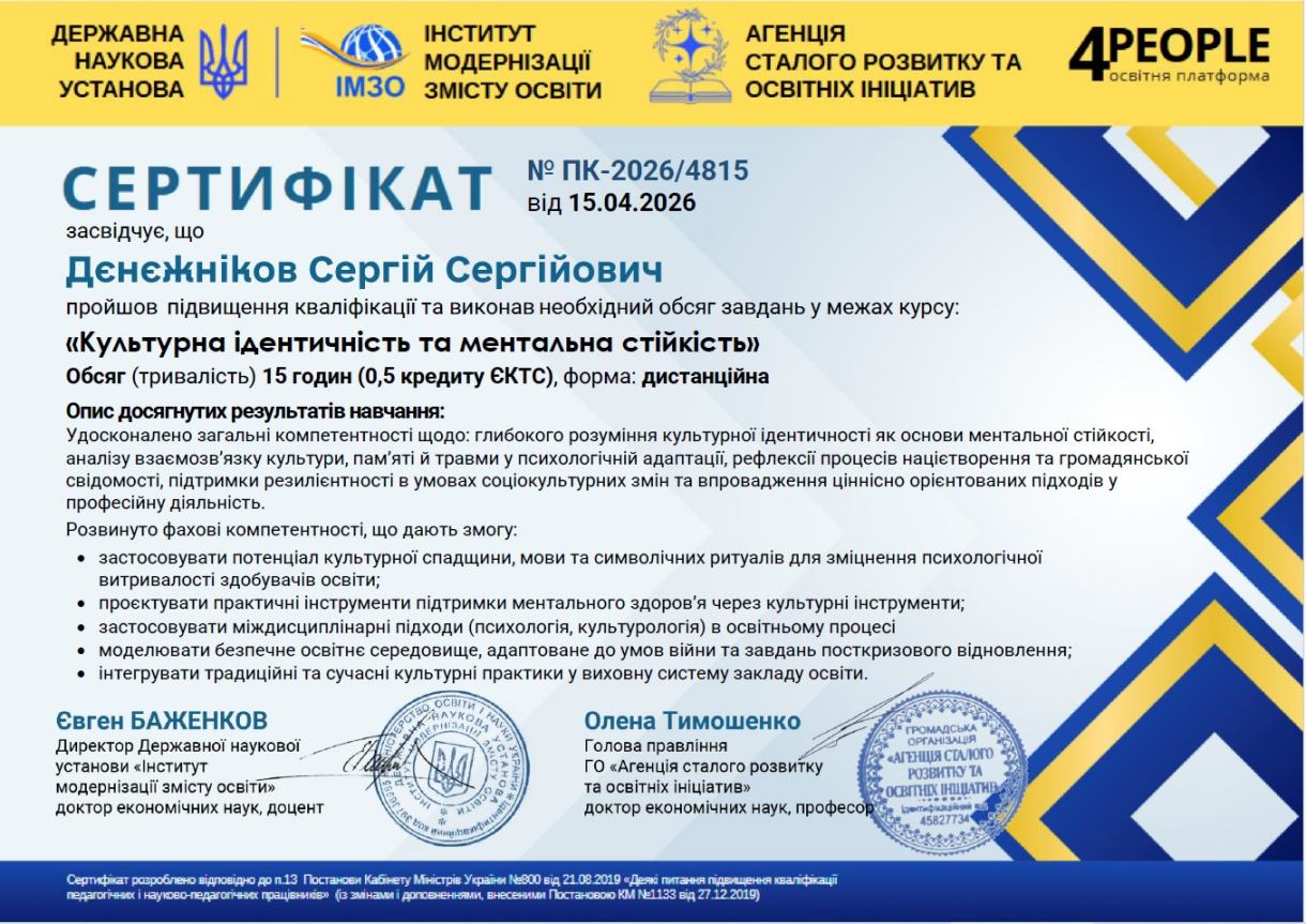 14-15 квітня 2026 року завідувач кафедри менеджменту освіти та педагогіки вищої школи Сергій ДЄНЄЖНІКОВ брав участь у всеукраїнському онлайн-курсі «КУЛЬТУРНА ІДЕНТИЧНІСТЬ ТА МЕНТАЛЬНА СТІЙКІСТЬ» за участі представників зарубіжних країн.